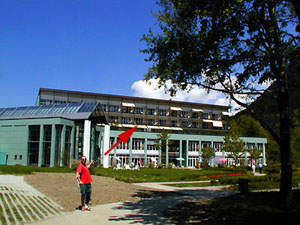 Teil 2: Klinik Valens, 2.-23. Mai 2001 Nette Lage, frisch renoviert: Ein Bijou von Klinik - zwar im hintersten Krachen gelegen und nur über eine kurvige Strasse erreichbar, aber (gerade bei Sommerwetter) die Idylle pur. Am 2. Mai räumte ich das Zimmer in Chur, um in eine bislang unbekannte Gegend am Ende der Welt abzutauchen... Unterdessen - zweieinhalb Wochen nach dem Unfall - kam ich mit den Krücken schon ganz gut alleine zurecht, also verfiel ich schon fast wieder dem weltlichen Luxus: Der anfängliche Ärger über die Teilung eines Fernsehgerätes mit Zimmergenossen, die meistens andere Sachen sehen wollten, oder den Tagesplan, der schon mitten in der Nacht (7.30 Uhr!?) Trainings vorsah, verflog schnell, denn hier war ich an einem guten Ort gelandet, an dem geniale Sachen vollbracht werden. Es mag zynisch tönen, aber auch die Tatsache, dass einem den ganzen Tag weitaus schwerer Fälle als man selbst begegneten, trug dazu bei, dass es einem Wohl war in seiner Haut . Das anfängliche Gefühl eines Militärlagers ("Tragen Sie im Essenssaal bitte angebrachte Kleidung" - wie zum Henker sollte ich denn bei meiner Schiene bitte nur schon Jeans anziehen?!) wich schnell einem Gefühl, hier gar nicht mehr weg zu wollen. » Was läuft hier so alles? Viel! - Website der Klinik Valens Der Mann mit den Krücken wohnt im Hoteltrakt, der im 2. Stock eine Spitalabteilung hat. Links im unteren Bild das Thermalbad... |
