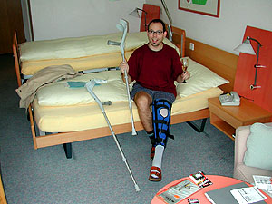 ... das auch öffentlich zugänglich ist. Die Therapien finden allerdings in einem abgetrennten Therapiebad statt. Im Tamina-Tal wurde das Thermalwasser schon vor Jahrhunderten genutzt - die Badegäste wurden damals in Körben zum schier unzugänglichen Bad hinuntergelassen. Aus dem Info-Prospekt der Klink Valens: "Über zehn Jahre strömt das Wasser durch die gewaltigen Naturkräfte im Inneren der Berge. Auf dem Weg durch das Dunkel des Gesteins baut es seine Heilwirkung auf und erblickt schliesslich als Quelle von Pfäfers in der Taminaschlucht das Licht der Welt. (...) Verbürgt ist, dass Johann II. von Mendelbüren 1350 in der Felsenhalle über der Tamina das erste Badehaus einrichten liess und Paracelsus als 1535 als Arzt in der Taminaschlucht wirkte. Der Zugang zum Bad war mehr als wild und rauh. An diesen 'Ort schrecklichster Verlassenheit' mussten die Patienten in einem Korb hinabgelassen werden." 1968 schliesslich entstand die Klink Valens unter dem Patronat der Kantone St. Gallen und Graubünden, in der "eine Symbiose von modernster Medizin mit uralten Erkenntnissen der Heilkraft der wasserreichsten Akratotherme Europas gepflegt wird." Ja und was treibt denn der Mann mit den Krücken so unterdessen? - Er muss vor jedem längeren Gang seine sexy Strümpfe anziehen ... ... um danach die Post-Op-Schiene überzustülpen, zu schnüren, die Krücken (und - OK - manchmal auch andere Sachen) zur Hand zu nehmen ... ... die mit der Zeit aber unangenehme Dellen und den Unterarmen zur Folge hatten. Da trat aber schon das geniale Team der Klinik auf den Plan; hier sind Sonderwünsche niemandem lästig... Kiki von der Ergotherapie konstruierte innert Minuten eine Spezialpolsterkonstruktion - und die Dellen verschwanden. Mit solcherlei Basteleien ausgerüstet gehts los auf Tal-Erkundung: Zuhinterst versteckt liegt nach einigen Staumauern das Walserdorf St. Martin. »