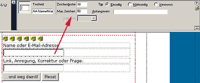 Ein kleines Formular soll also vorerst reichen: Zwei Textfelder sowie ein Absenden-Button. Auf den oft noch gesehenen Reset-Button sollten Sie verzichten - er ist überflüssig (zu schnell angeklickt und dann ist alles weg...). Fügen Sie auf eine beliebige Seite mit Dreamweaver zwei Textfelder und eine Schaltfläche ein (mit "Einfügen / Formularobjekt / ..."). Oft hilft eine Tabelle oder ein spezielles CSS-Konstrukt zur besseren Anordnung. Wer das Ganze schnell haben will, kann hier auch den gesamten Code kopieren und im HTML-Bearbeitungs-Modus in die Seite einfügen (nicht vergessen - da wo's steht, die eigene Mailadresse eintragen).