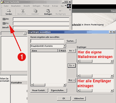 Outlook Express Neues Mail öffnen, auf "cc" klicken (Pfeil 1), neues Fenster "Empfänger auswählen" erscheint. Hier eigene Adresse im Feld "Empfänger" und alle anderen im Feld "Bcc" eintragen: