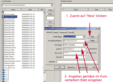 ... und mit dem Klick auf den Pfeil nach rechts werden alle diese Dateien/Ordner hochgeladen. Natürlich klappt das auch umgekehrt. Wenn ihr z.B. zu Hause die im Kursraum erstellten Dateien herunterladen wollt, markiert die Dateien auf der rechten Seite (Server), wählt links das korrekte Verzeichnis aus und klickt auf den Pfeil nach links - und die Dateien werden heruntergeladen. Wenn ihr WS_FTP schliesst, sollten die Login-Angaben nun weiterhin gespeichert sein (ausser das Passwort). Dies gilt für daheim, in Kursräumen ist dies leider nicht immer der Fall. Einfach links unten auf "Connect" klicken, wenn das Login-Feld nicht erscheint. Bitte nochmals beachten: Gross-/Kleinschreibung der Dateien spielt eine Rolle (eine Datei bild.htm wird nicht angezeigt, wenn sie als Bild.htm im HTML-Code steht). Das gilt auch für Ordner: Eine Datei bild.jpg im Unterordner "Fotos" wird auch nicht angezeigt, wenn der Ordner "fotos" heisst. Alle Dateien müssen zudem ihre korrekte Endung haben (.jpg, .gif, .htm, .html usw.). Daher ist es SEHR wichtig, dass ihr in einem Webprojekt von Beginn an die allgemeingültigen Konventionen für Dateinamen beachten: