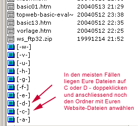 ERST DANN (erst wenn ihr GANZ sicher seid, dass alle Werte auf jeden Punkt genau stimmen und am richtigen Ort sind), OK klicken. Die Verbindung sollte nun zustande kommen. In der linken Hälfte des Fensters sind die Daten der eigenen Harddisk, rechts diejenigen auf dem Server. Auf der Linken Seite müsst ihr nun den Ordner auf Laufwerk D auswählen, der Eure Website-Daten enthält. Dafür einfach das Laufwerk doppelklicken: