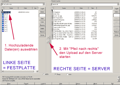 Also: LINKS im Fenster seht ihr nun den Inhalt des Ordners, der Eure Website-Dateien beinhaltet. RECHTS ist sichtbar, was auf dem Server in Eurem Ordner liegt (am Anfang natürlich leer). Wenn ihr nun links bei Euren Website-Dateien eine Datei anklickt und auf den Pfeil nach rechts in der mittleren Spalte klickt, müsste eure Datei hochgeladen werden: