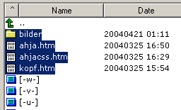 Tut dies nun mit all euren erstellten Dateien und Unterordnern. Eure Website sollte - sofern alles geklappt hat - nun unter einem URL (Internetadresse mit http://...) abrufbar sein, den ihr im Kurs erhält (siehe Dokumentation). Mehrere Dateien auf einmal auswählen kann man, indem man die oberste Datei (oder den Ordner zuoberst) anklickt und dann bei gedrückter SHIFT-Taste die unterste Datei. Das sieht dann so aus...