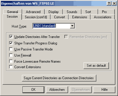 Wenn am Anfang was nicht klappt, fehlt wahrscheinlich die Datei index.htm oder index.html. Wenn Links nicht gehen oder Bilder nicht angezeigt werden, liegts meistens dran, dass sie falsch geschrieben sind im Quellcode (GROSS-/kleinschreibung!) oder vielleicht vergessen wurden beim Auf-den-Server-Übertragen (alle Unterverzeichnisse da mit korrekter Schreibweise?). Achtung, in WS_FTP führt in der Standardeinstellung ein Doppelklick meistens dazu, dass die Datei übertragen wird (auf den Server oder vom Server) - alte Fassungen werden dabei ohne Warnung überschrieben... also Vorsicht beim Klicken. Weitere Hinweise für WS_FTP! Wenn ihr möchtet, dass auf der linken Seite immer der richtige Ordner (mit Euren Websitedaten) angezeigt wird, könnt ihr unten im WS_FTP auf "Options" klicken und danach "Save Current Directories as Connection Directories" anklicken - WS_FTP merkt sich dann in der Session-Einstellung, welche Ordner von Beginn an angezeigt werden sollen: