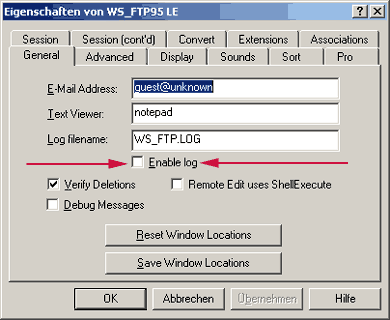 ... und bei "Enable Log" das Häkchen wegnehmen. Achtung: Nach rund zwei Minuten ohne Ladevorgang bricht die Verbindung zum Server ab (Meldung: "Timeout, closing control connection") und muss neu aufgebaut werden (Klick auf "close", dann auf "connect"). Das hat nichts mit WS FTP zu tun, sondern mit den Sicherheitseinstellungen des Servers. Und zum Schluss noch dies: