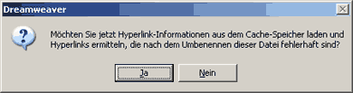 Zurück zur Site! Zuerst werden ab sofort alle Links und Verweise automatisch angepasst, wenn Sie eine Datei umbenennen oder innerhalb der Site verschieben. Dreamweaver fragt vorher jeweils nach, ob das Programm nach Dateien suchen soll, die geändert werden müssen: