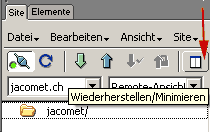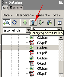 Unten haben Sie das sogenannte Eigenschaften-Fenster, hier können Sie (wie Sie es von Word gewöhnt sind) Texte mit bestimmten Attributen oder Links versehen, Bilder einfügen usw. Rechts haben Sie Ihr Site-Verwaltungsfenster, wo Sie alle Dateien Ihrer Site stets sehen. Die Verwaltung der Site (Umbenennen von Dateien, Verschieben von Dateien in andere Ordner usw.) geschieht HIER (und NUR hier). Wenn Sie Dateien auf den Server schieben wollen, stellen Sie sicher, dass die Angaben zum Server (siehe oben) korrekt sind. Die schnellste Variante ist sodann, die Datei oder den Ordner einmal anzuklicken, den Sie auf den Server aufschalten wollen, und dann den "Bereitstellen"-Knopf zu klicken, wobei "Bereitstellen" hier etwas umständlich für "auf den Server kopieren" steht: