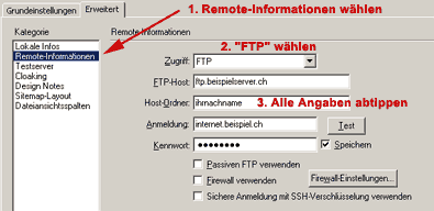 Unter "Host-Ordner" muss ein auf dem Server existierender Ordner eingegeben werden, in unserem Fall "ihrnachname" (ein unterverzeichnis mit ihrem familiennamen in kleinschreibung, das ich bereits erstellt habe). So wird die Verbindung von Beginn an in den richtigen Ordner auf dem Server hergestellt. All diese Angaben ändern natürlich von Server zu Server! Nochmals: Hier sehen Sie ausschliessich Beispielwerte, die einzig richtigen Angaben finden sich auf dem farbigen Blatt in Ihrer Dokumentation und müssen auf den Punkt genau exakt eingegeben werden.