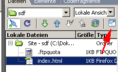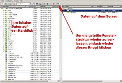 Dort, wo vor kurzem noch "lokale Ansicht" stand, steht nun "Remote-Ansicht", was soviel bedeutet wie "Ansicht der Daten auf dem Server". Viel wird hier am Anfang nicht sichtbar sein. Sie können ja z.B. als Test mal einen neuen Ordner erstellen, indem Sie mit der rechten Maustaste auf den leeren Bereich oder den Servernamen klicken und "Neuer Ordner" wählen. So können Sie diesen später auch löschen. Der Button ganz rechts in der Siteverwaltung dient dazu, gleichzeitig die Datenstruktur auf der Harddisk und auf dem Server nebeneinander darzustellen: