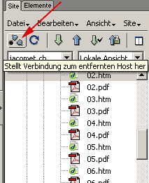 Kommt nur eine Fehlermeldung? Dann haben Sie leider die Server-Werte vom Blatt falsch abgetippt. Wählen Sie "Site / Sites verwalten" (frühere DW-Fassungen: "Site / Sites bearbeiten"). Wählen Sie Ihre soeben definierte Site aus und wählen Sie "Bearbeiten". Unter "Remote-Informationen" korrigieren Sie Ihre Eingaben, die Sie alle mit "OK / Fertig" bestätigen, bis Sie wieder am Anfang sind. Versuchen Sie es nochmals. Wenns nicht klappt, rufen Sie mich ungeniert! Zu Ihrer Beruhigung: Die wenigsten schaffen das auf Anhieb. In einigen Wochen können Sie dies im Schlaf. Sie können übrigens auch manuell einen Blick auf den Server werfen, um dort Ordner zu erstellen oder andere Arbeiten zu erledigen. Klicken Sie auf den "Verbinden"-Button: