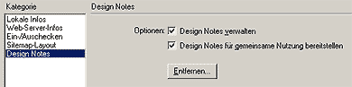 PS: Falls Sie sich schon gewundert haben, was das lästige Verzeichnis "_notes" soll, das sich in Ihrem Auftritt ständig neu einnistet, seien Sie unbesorgt - dies dient den sogenannten Design Notes, die wichtig sind, wenn ein Team an einer Website arbeitet. Dies würde in diesem Kurs zu weit führen. Was Sie wissen müssen: Wenn Sie diese Funktion nicht brauchen, schalten Sie sie in den Optionen der Site aus (Site / Sites bearbeiten / Ihre Site auswählen). Unter "Design Notes" entfernen Sie dann die Häkchen. Zudem sollten Sie unter "Ein-/Auschecken" sicherstellen, dass die Funktion deaktiviert ist.