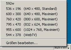 Dreamweaver bietet rechts unten dazu ein Hilfsmittel, mit dem man die Fenstergrösse an die jeweiligen Monitore anpassen kann. Das empfehle ich nicht - aber die jeweiligen Werte sind wichtig für die maximal erlaubten Tabellenbreiten je nach Bildschirmauflösung, für die man designen will: