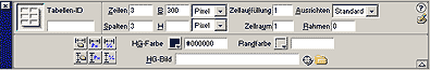 Definiert wurde hier zunächst die Breite 300 Pixel. Dann wurden der Rahmen auf 0 Pixel gesetzt, Zellauffüllung und Zellraum auf 1 Pixel gesetzt sowie die Hintergrundfarbe (HG-Farbe) auf schwarz (#000000). Danach wurde die Tabelle Zelle für Zelle markiert (Cursor in Zelle links oben platzieren, Maustaste gedrückt halten, bis zur Zelle rechts unten ziehen, loslassen) und das Eigenschaftenfenster so modifiziert: