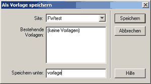 Öffnen Sie nun eine beliebige "fertige" Seite Ihres Web-Angebots oder eine früher erstellte Übungsseite. Alternativ können Sie auch eine vorgefertigte Testseite verwenden, die hier gezippt zur Verfügung steht. Falls Sie noch keine Site definiert haben, tun Sie dies jetzt! Wählen Sie "Datei / als Vorlage speichern" und geben Sie im Feld "Speichern unter" des erscheinenden Fensters "vorlage" ein: