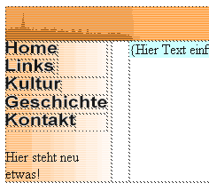 Sobald Sie sicher sind, dass die Maske für Ihre neue Website steht, können Sie diese im Dreamweaver als Vorlage (Template) definieren. In der Vorlage werden Bereiche markiert, die veränderbar sind - alle anderen Elemente, die überall gleich aussehen (z.B. Navigation), bleiben quasi "gesperrt", wenn Sie Dateien ab dieser Vorlage herstellen. Der Vorteil tritt vor allem zu Tage, wenn Sie ohne PHP-includes (kommt später in Übung 22) arbeiten: Sobald Sie Navigationspunkte hinzufügen oder löschen, machen Sie dies nur einmal in der Vorlage. Falls Sie konsequent alle Seiten ab dieser Vorlage erstellt haben (das ist die Bedingung!), werden alle Seiten bei einer Änderung der Vorlage automatisch angepasst. Alles, was Sie tun müssen, ist, die Seiten nochmals auf den Server zu schieben - fertig.