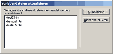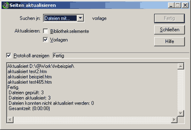 Gepüft: 3 / Aktualisiert: 3 - also alles nach Wunsch verlaufen. Wenn Sie nun die Dateien öffnen, werden Sie sehen: Die Änderung wurde global übernommen - auf allen Seiten, die auf der Vorlage basieren. Stellen Sie neue Seiten darum immer auf Basis einer Vorlage her. Nachträgliches Verknüpfen einer Datei mit einer Vorlage ist zwar möglich (siehe Menu Ändern / Vorlagen), aber führt unweigerlich zu Komplikationen, wenn die Layouts verschieden sind - solche Fenster sind dann die Folge...