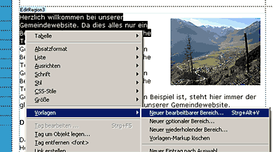 In Ihrer Site wird nun automatisch ein Ordner "Templates" erstellt, darin erscheint neu die Datei vorlage.dwt (= Dreamweaver Template), und Ihre offene Datei hat neu im blauen Balken oben die Bezeichnung << Vorlage >> (vorlage.dwt). Diese Datei ist nun Ihre Vorlage für alle weiteren Seiten. Nun müssen noch Bereiche definiert werden, die später verändert werden dürfen. Schreiben Sie am besten ein wenig Beispieltext an den Ort, den Sie später editierbar machen wollen. Markieren Sie dann den Text (z.B. da, wo später der Lauftext der Seite stehen soll). Kilcken Sie dann am besten mit der rechten Maustaste in die Markierung und wählen Sie "Vorlagen / Neuer bearbeitbarer Bereich" aus: