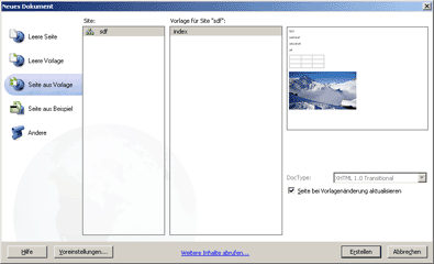Editierbare Bereiche haben jeweils einen hellblauen Rahmen. Fahren Sie so fort, bis alle Bereiche, die später editierbar sein müssen, auch so sind. Speichern Sie die Vorlage am Schluss. Schliessen Sie alle offenen Dateien. Wenn Sie nun eine neue Seite auf der Basis dieser Vorlage erstellen möchten, wählen Sie einfach "Datei / Neu" und dann den Reiter "Vorlage" (CS3: "Datei / Neu" > Seite aus Vorlage) - und zum Schluss klicken Sie Ihre Site an - die Vorlage erscheint: