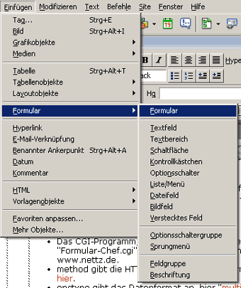 Aber zuerst brauchen wir ein Formular auf einer Website! Formularfelder werden in Dreamweaver mittels "Einfügen / Formular / ... " eingefügt. Wenn Dreamweaver fragt, ob der FORM-Tag hinzugefügt werden soll, bitte JA antworten - so ersparen Sie sich die Sorge, den obligatorischen FORM-Tag später manuell einzufügen.