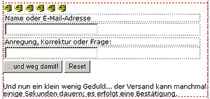So haben wir also mit der Zeit ein fixfertiges Formular - wundern Sie sich nicht über den roten Rahmen im Dreamweaver um das Formular, er ist im Browser unsichtbar: Im Dreamweaver sieht dies so aus: