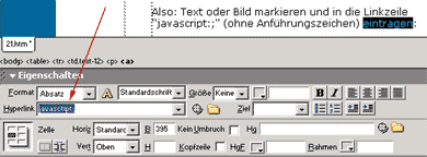 So, wir sind nun fast bereit! Nun müssen wir noch abschätzen, wie gross das Fenster tatsächlich werden muss. Oben, rechts und links vom Bild soll ja noch etwas Weissraum sein, und unten steht ja noch der Text... 680x545 Pixel wird die Lösung sein, manchmal braucht es noch ein wenig Feinjustierung im Nachhinein. Jetzt aber zur Verlinkung dieses Fensters! Den Link auf das Popup setzen Wenn wir ein Bild mit einem Link versehen wollen, ist das kein Problem - man kann right away loslegen. Wenn wir aber ein Stück Text verlinken möchten, muss aber zuerst dem zu verlinkenden Text (beim Klick auf den Text soll eben das Fenster aufgehen) ein "Dummy-Link" verpasst werden, d.h. ein leerer Link, bei dem alleine an sich nichts passiert. Ohne diesen Leeren Link kann man leider keine Verhaltensweisen anhängen. Also: Text markieren und in die Linkzeile "javascript:;" (ohne Anführungszeichen) eintragen: