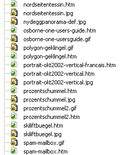 Wer kennt das Problem nicht: Man möchte eine möglichst schnell ladende Seite machen und Platz bei der Ladezeit der Bilder sparen - was aber heisst, dass bei einem Klick auf die Thumbnails meistens ein hässliches grosses Browserfenster mit target=_blank aufgeht, das irgend eine Grösse hat und nicht wirklich schön ist. Was also tun, damit das ganze einigermassen attraktiv wird? Richtig: Javascript hilft, und Dreamweaver hilft noch mehr. Unter "Verhalten" finden wir die Funktion "Browserfenster öffnen" - genau, was wir brauchen. Zuerst das zu öffnende Fenster machen Wie so oft im Webpublishing muss man nun schon etliche Schritte voraus denken, so muss z.B. die Grösse und Beschaffenheit des aufgehenden Fensters klar sein. Will man Scrollbalken oder nicht? Welche Browserleisten will man anzeigen? Wieviel Leerraum will man ums Bild herum haben, wenn man denn ein Bild verlinkt? Wie gross muss folglich das Fenster in Pixeln genau sein? Gehen wir in dieser Übung davon aus, dass wir eine Thumbnail-Liste haben - beim Klick auf die kleinen Bilder erscheint eine grössere Fassung in einem Browserfenster. Zuerst muss also einmal eine leere HTML-Seite her, denn ein Popup besteht immer aus einer mit was auch immer gefüllten Webseite. Bei uns muss da also ein Bild rein - die grössere Fassung eben. Um Ordnung zu schaffen, brauchen wir zuerst mal einen Ordner, wo diese Dateien drin sind - vielleicht sogar die grösseren Bilder selbst. Das ist aber Ihnen überlassen. Bei mir sieht der Ordner mit allen Popups so aus: