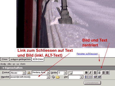 ...und vollführen noch einige Kniffs: Unter dem Bild soll ein Text folgen, der das Schliessen des Popups ermöglicht. Zusätzlich können Sie das Bild ebenfalls mit diesem Link versehen - er lautet "javascript:self.close();". Statten Sie das Bild mit einem ALT-Text aus (à la "Hier klicken zum Schliessen" oder so). Wenn Sie Ihre User für ganz Gescheit halten, können Sie den Text auch weglassen und hoffen, dass die Leute drauf kommen, aufs Bild zu klicken (ALT-Text darf dann keinesfalls fehlen).