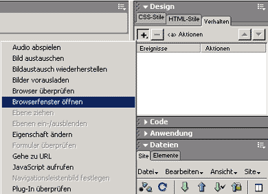 Damit haben wir unseren leeren Link. Früher pflegte man einfach einen "Gartenhag" (#) zu machen, was aber in vielen Browsern dazu führte, dass man damit auf der Seite, die den Link enthielt, auch gleich ganz nach oben hüpfte - ein unangenehmer Nebeneffekt. Nun können wir uns daran machen, den Link zu vergeben - dazu einmal in den zu verlinkenden Text klicken oder das Bild einmal anklicken, dann in die Bedienfeldgruppe "Verhalten" wechseln und die korrekte Funktion wählen: